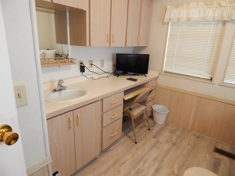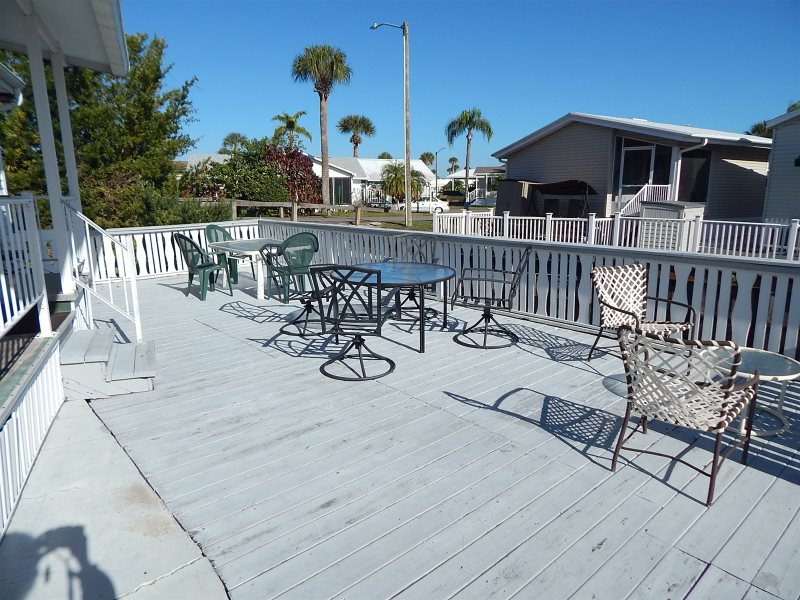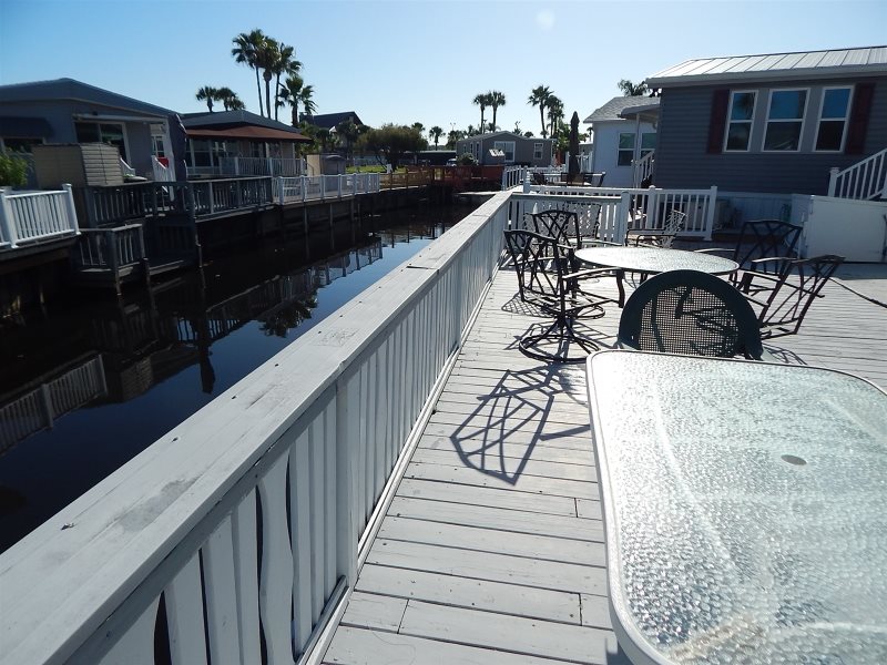Park Model #255 is a two bedroom / one bathroom, double-wide home on the canal with a large deck area for entertaining. It is conveniently located close to our Club House and larger swimming pool. It can sleep up to 5 (children allowed) with a full-size bed in the main Bedroom, a daybed in the second Bedroom, and a Queen-size sofa sleeper in the Living Room. It features internet service, three television sets (Living Room, Main Bedroom, Bedroom #2) with cable TV service, fully equipped kitchen (dishwasher, utensils, cookware, dishes, glasses, flatware, etc.), towels and bed linens, and a stackable washer and dryer. This home does allow a pet.
